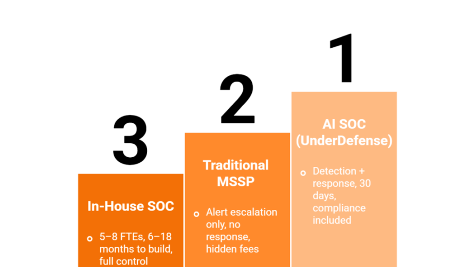 For most mid-market organizations with 2-10 security analysts, the partner path delivers the fastest ROI because it eliminates the hiring, training, and 24/7 coverage gap simultaneously. Mid-market teams face the same threats as Fortune 500 companies but with 10-20% of the budget. We built UnderDefense MAXI for teams that cannot afford enterprise complexity, with turnkey 30-day onboarding, zero rip-and-replace, and published pricing that includes the platform, analysts, and compliance evidence generation.