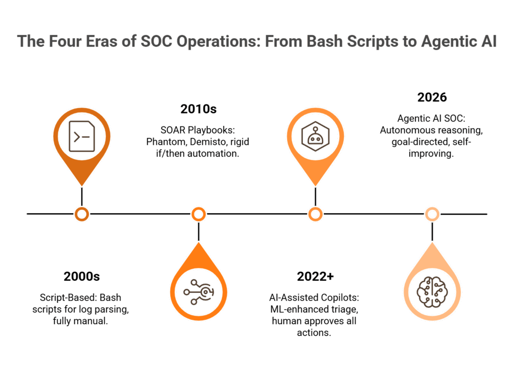 The SOC has gone through four distinct eras. Bash scripts for log parsing in the 2000s. SOAR playbooks (Phantom, Demisto) in the 2010s. AI-assisted copilots from 2022 onward. And now, in 2026, agentic AI SOCs where the system reasons across your entire stack, not just executing rules someone wrote, but deciding what to investigate and how.