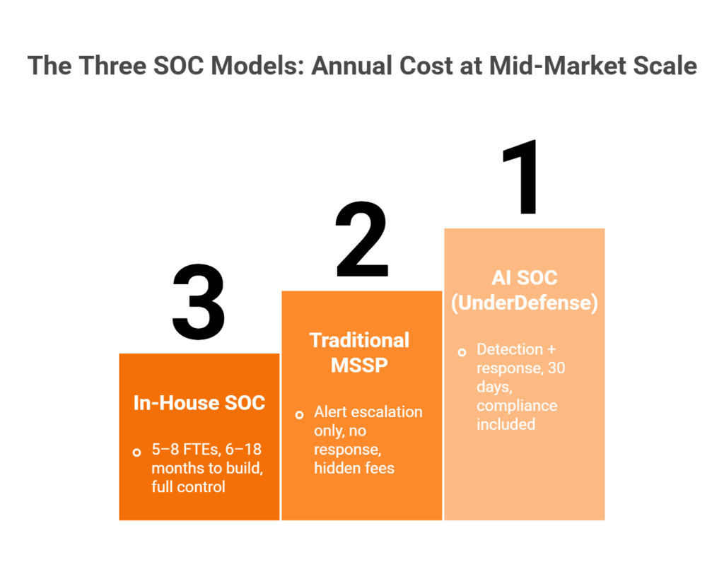 • In-House SOC: $1M–$4M+/year. Full control, full ownership. You manage the team, the tools, and the 2 AM ransomware calls.