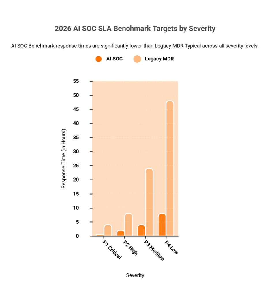 This is the section your procurement team should bookmark. Below are the specific numeric benchmarks, severity-tiered MTTR targets, alert-to-triage time windows, and false positive rate SLAs, that separate a real AI SOC commitment from marketing language.