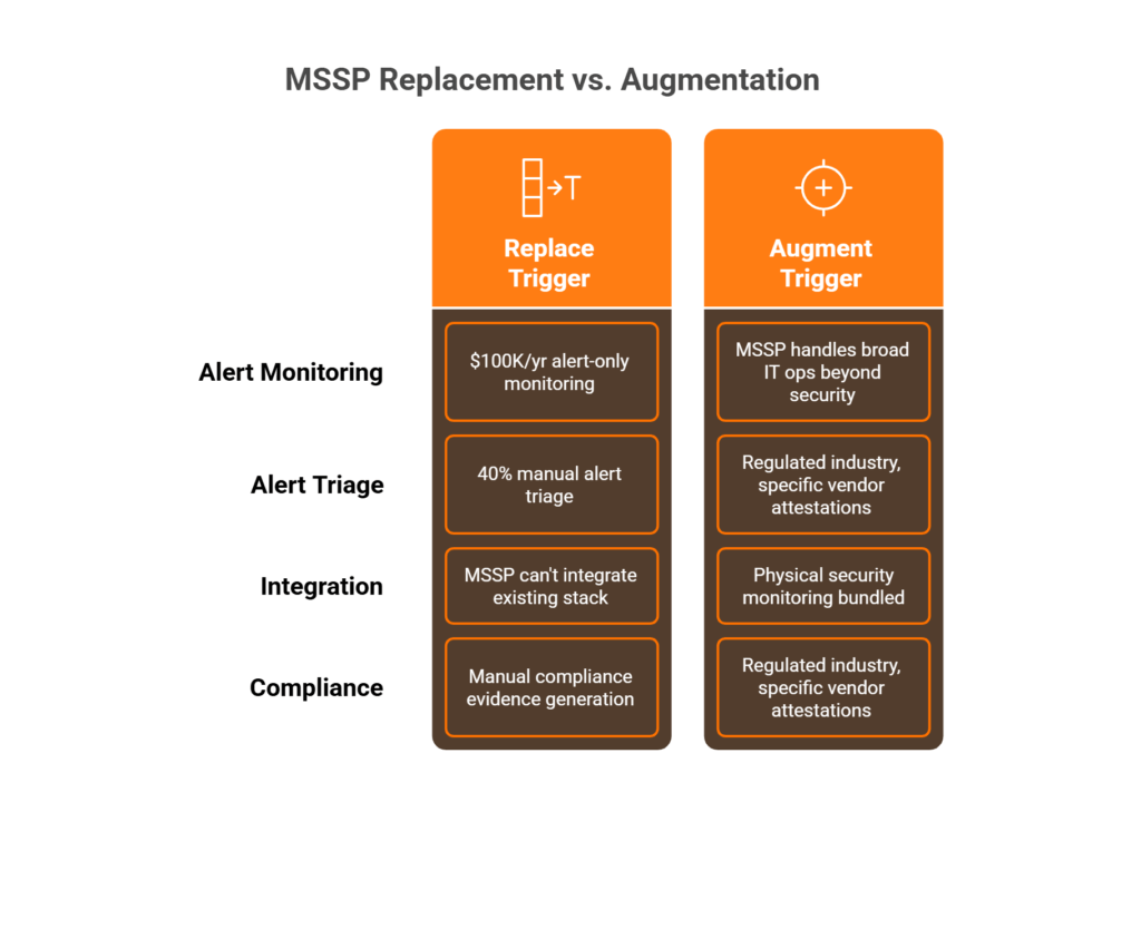 We recommend augmenting (not replacing) if your MSSP handles broad IT operations beyond security, if your regulated industry requires specific vendor attestations, or if physical security monitoring is bundled in the contract.