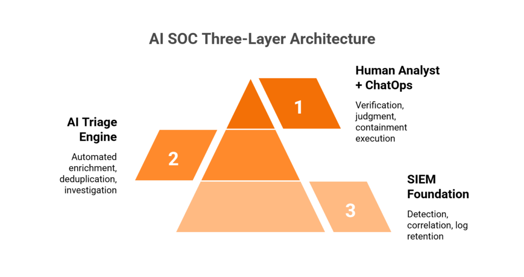This matters because your SIEM investment represents months of detection engineering, custom correlation rules, and deep institutional knowledge. Ripping that out to adopt a vendor-locked alternative means losing business logic you can’t rebuild overnight. An AI SOC preserves that investment and extends it with 24/7 automated investigation, ChatOps-based user verification, and human analyst judgment for edge cases.