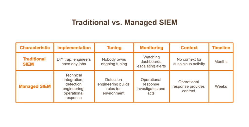 This is the shift managed SIEM represents: moving from “we installed the software” to “we’re detecting and responding to threats.” The difference matters because attackers don’t care about your deployment timeline; they exploit the gap between tool installation and effective security operations.