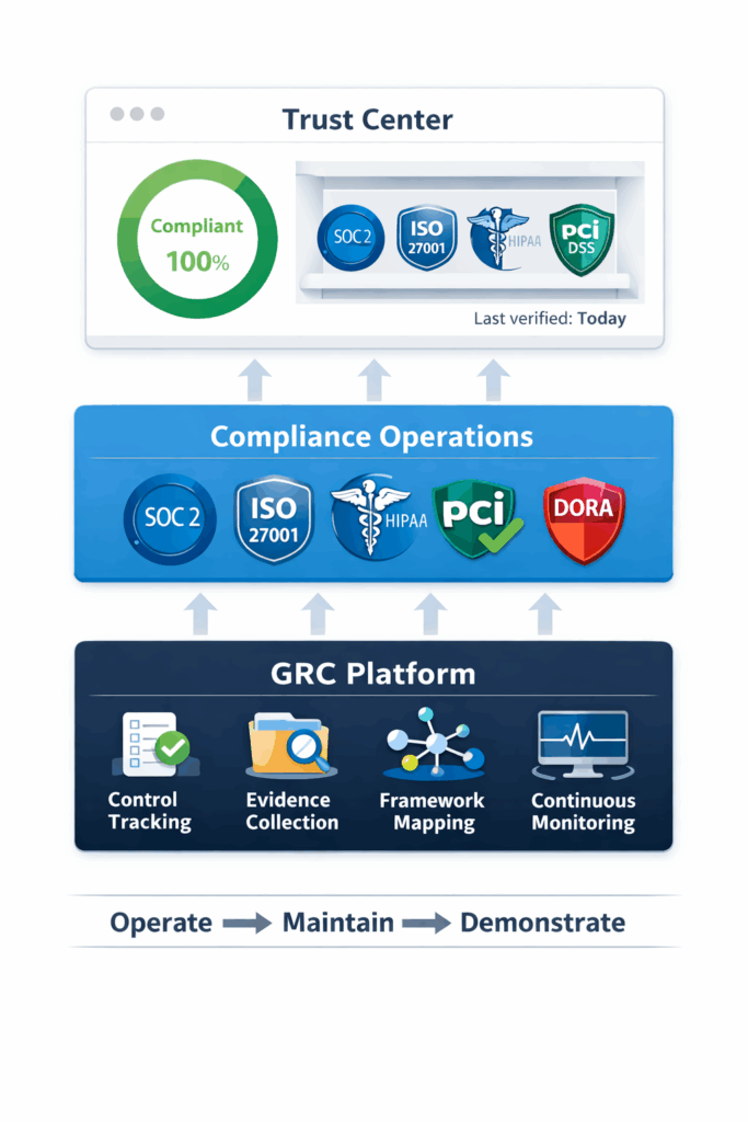 💡 The Critical Distinction: A Trust Center that is not connected to a live GRC platform is just a website with old PDFs. The moment your controls change, your certifications lapse, or a new framework requirement appears, a static Trust Center becomes misleading. That is more damaging than no Trust Center at all. Currency is the whole point.